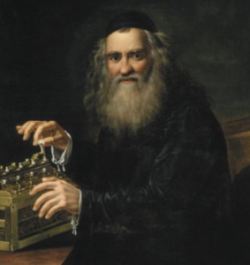 Abraham Stern, Porträt des Erfinders mit seiner mechanischen Rechenmaschine,